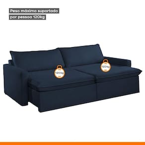 O revestimento em tecido com manta acrílica recebe costura com pesponto duplo, feito com máquinas de ponto eletrônico, proporciona beleza nos desenhos captonê e resistência da costura Acompanha Almofadas extras: Não Almofada do assento: Fixa Almofada do encosto: Removível Altura do assento até o chão: 53 Altura do Encosto: 42 Altura dos Pés: 2.5 Ambiente Principal: Sala de Estar Complexidade da Montagem: Baixa: pode ser montado por uma pessoa sozinha Cor: Azul Cor do Produto: Azul Densidade do Assento: D-28 Densidade do Encosto: D-18 Enchimento do Assento: Hyper Soft Enchimento do Encosto: Fibra Siliconada Estilo de Braço: Braços Quadrados Firmeza do Assento: Macio Itens Inclusos: 1 Sofá, Kit Ferragens e Manual de Montagem Material dos Pés: Madeira Necessita Montagem: Sim Origem do Produto: Nacional Peso: 82.02 Pet Friendly: Não Possui Percintas Elásticas: Sim Possui Pés: 08 Possui Rodízio: Sim Profundidade Quando Estendido: cm Recomendações de Uso, Manutenção e Limpeza: A limpeza do revestimento deve ser feita com escova ou tecido de algodão branco levemente umedecidos em água morna, sabão neutro ou produto específico. Não usar produtos corrosivos nem a base de solventes, como: cloro, alvejantes, detergentes, entre outros;Não expor o estofado à luz direta. Mantenha portas e janelas sempre protegidas com cortinas e blackout. A exposição contínua à radiação da luz, danifica o revestimento, apodrecendo os fios, trincando a superfície e desbotando as cores;Não lavar o revestimento das almofadas pois pode desfiá-las, abrindo as costuras;Não utilizar o estofado para fins diferentes do que foi projetado: ficar em pé, pular, arrastar, sentar nos braços, peso na caixa traseira, entre outros tipos de ações que poderão danificar o produto. Resistente à Chuva: Não Revestimento do Braço: Veludo Rodízio com Trava: Não Sistema de Montagem: Sim Suporta Até (kg): 120 Tecido Predominante: Veludo Tipo de Encosto: Fixo Tipo de Mola: Molas Espirais Ean: 7908551959729