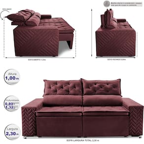 Sofá Retrátil e Reclinável 2,30m Essence. Velusoft Cama inBox - Vinho