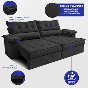 Sofá Retrátil e Reclinável 2,40m com Molas e Espuma D33 Thunder. Velusoft Cama inBox - Preto