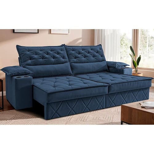 Sofá Retrátil E Reclinável 2,40m Com Porta Copos E Molas Cosmos. Velusoft Cama Inbox Azul