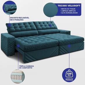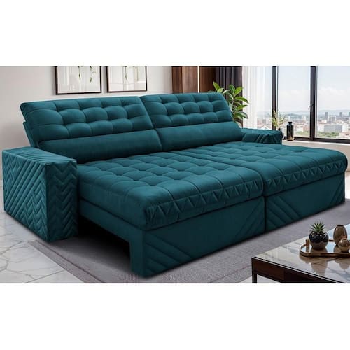 Sofá Retrátil E Reclinável 2,50m Molas Ensacadas Max Spring. Velusoft Cama Inbox Petróleo