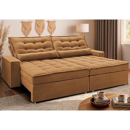 Sofá Retrátil E Reclinável 2,52m Molas Ensacadas Belle. Boucle Cama Inbox Caramelo.
