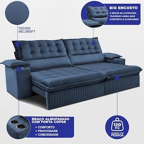 Sofá Retrátil E Reclinável 2,60m Molas Ensacadas Dream. Velusoft Cama Inbox Azul