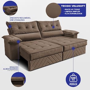 Sofá Retrátil e Reclinável 2,80m com Molas e Espuma D33 Thunder Velusoft Cama inBox