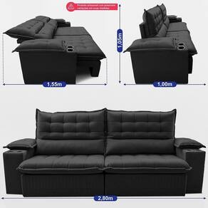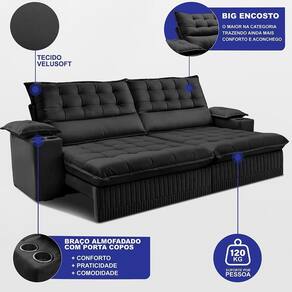 Sofá Retrátil E Reclinável 2,80m Molas Ensacadas Dream. Velusoft Cama Inbox Preto