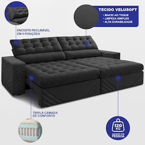 Sofá Retrátil e Reclinável 3,00m Molas Ensacadas Max Spring. Velusoft Cama inBox