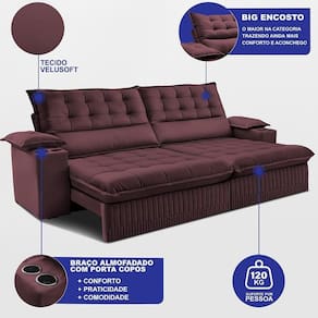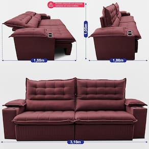 Sofá Retrátil E Reclinável 3,10m Molas Ensacadas Dream. Velusoft Cama Inbox Vinho