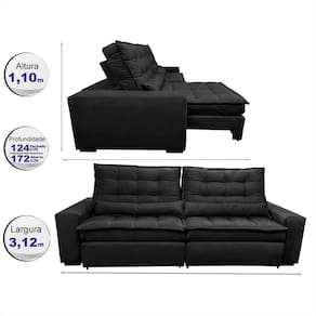 Sofá Retrátil e Reclinável 3,12m Molas Ensacadas Cama inBox Catar. Velusoft - Preto