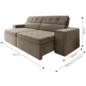 Estrutura: Madeira de Eucalipto reflorestamento Revestimento: Tecido Veludo Fino ParisAssento: Retrátil, em espuma D21 selada e percintas elásticas, com Pillow Top de 12 cm e corre em tubo de açoEncosto: Reclinável, com 4 estágios de reclinação, enchimento em flocos mesclados e fibra siliconadaBraço: Fixo, em espuma D16Pés: Sim, em PVC com rodízios com base de ferroSuporta Peso de até: 120 Kg por assentoDimensões do produto montado