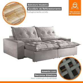 Estofado Retrátil e Reclinável Avalon é um modelo com poucos detalhes e muita autenticidade. A estrutura de madeira maciça de eucalipto seca e imunizada segue um rigoroso procedimento de montagem. Os revestimentos internos são de "Pet Fon", um produto sintético, resistente e durável. O encosto com enchimento em fibra siliconada para seu bem-estar. Acompanha almofada rinheira preenchida com fibra siliconada. Para escolher a melhor comodidade a catraca é reclinável com cinco estágios. O assento de pillow com espuma elástica certificada, medindo 18 cm de altura. A base do assento com molas espirais e percinta elástica de alta resistência permite um acolhimento confortável para relaxar. Possui também possui mecanismo retrátil em aço que permite abertura do sofá para sua maior comodidade. O revestimento em tecido com manta acrílica recebe costura com pesponto duplo, feito com máquinas de ponto eletrônico, proporciona beleza nos desenhos captonê e resistência da costura. O braço é composto por espuma D23 revestido com manta acrílica Acompanha Almofadas extras: 02 Almofada do assento: Fixa Almofada do encosto: Fixa Altura do assento até o chão: 51 Altura do Encosto: 62 Altura dos Pés: 2.5 Ambiente Principal: Sala de Estar Complexidade da Montagem: Média: pode ser montado por mais de uma pessoa e/ou necessite de maior conhecimento para montagem Cor: Veludo Cinza Cor do Produto: Veludo Cinza Densidade do Assento: D-18 Densidade do Encosto: D-18 Enchimento do Assento: Fibra Siliconada Enchimento do Encosto: Fibra Siliconada Estilo de Braço: Braços Quadrados Firmeza do Assento: Macio Informações Complementares: Itens Inclusos: 1 Sofá e Manual de Instruções Largura do Sofá Maior: Linha ou Coleção: Manual de Especificação Técnica: Manual de Montagem e Instalação: Material dos Pés: Madeira Montagem Flex: Necessita Montagem: Sim Origem do Produto: Nacional Peso: 115.51 Pet Friendly: Não Possui Percintas Elásticas: Sim Possui Pés: 08 Possui Rodízio: Sim Profundidade Quando Estendido: 180 Recomendações de Uso, Manutenção e Limpeza: A limpeza do revestimento deve ser feita com escova ou tecido de algodão branco levemente umedecidos em água morna, sabão neutro ou produto específico. Não usar produtos corrosivos nem a base de solventes, como: cloro, alvejantes, detergentes, entre outros;Não expor o estofado à luz direta. Mantenha portas e janelas sempre protegidas com cortinas e blackout. A exposição contínua à radiação da luz, danifica o revestimento, apodrecendo os fios, trincando a superfície e desbotando as cores;Não lavar o revestimento das almofadas pois pode desfiá-las, abrindo as costuras;Não utilizar o estofado para fins diferentes do que foi projetado: ficar em pé, pular, arrastar, sentar nos braços, peso na caixa traseira, entre outros tipos de ações que poderão danificar o produto. Resistente à Chuva: Revestimento do Braço: Veludo Rodízio com Trava: Não Sistema de Montagem: Parafusos e Encaixe Suporta Até (kg): 120 Tecido Predominante: Poliéster Tipo de Encosto: Regulável Tipo de Madeira Maciça da Estrutura: Tipo de Mola: Molas Espirais
