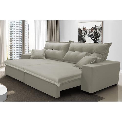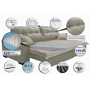 Características: -Encosto Reclinável com 5 posições, almofadas fixas compostas de 80% fibra siliconada e 20% flocos de espuma e percintas elásticas para maior conforto. -Assentos: Retráteis com pillow top em espuma D33 envolvidas com fibra SILICONADA compactada, Molas Ensacadas, percintas Pneumáticas com feltro para proteger do atrito com as molas. -Braços: Com 25cm de largura e com espuma D28. -Fixação: Grampos galvanizados. -Estrutura de Madeira maciça 100% eucalipto de reflorestamento, produto ecologicamente correto. -Tecido em linho com manta siliconada de alto padrão. -Técnica de Botonê com Botões para deixar mais elegante o encosto. -Acompanha 2 almofadas decorativas. -Pés em PVC.