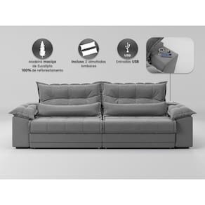 USB:Sofá com uma tomada contendo duas entradas USB para carregamento de eletrônicos, potência de 5V.Não incluso fonte de energia. Extensão do cabo da tomada pode variar de 70cm a 90cm.
