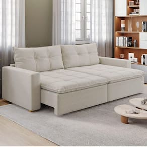 Material: O sofá possui estrutura em madeira de eucalipto reflorestada, assento retrátil com mecanismo metalico, espuma contínua D28 Supersoft sustentado por 4 molas de aço espirais e percinta sintética, encosto fixo com catraca em 3 estágios, almofadas com enchimento em fibra de silicone. O revestimento é em linho 100% poliéster, os módulos retráteis contam com rodinhas de silicone, os pés são de madeira e o acabamento é em costura prespontada com puxões no assento, unindo conforto, resistência e elegância.