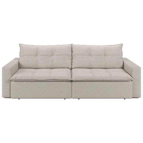 Material: O sofá possui estrutura em madeira de eucalipto reflorestada, assento retrátil com mecanismo metalico, espuma contínua D28 Supersoft sustentado por 4 molas de aço espirais e percinta sintética, encosto fixo com catraca em 3 estágios, almofadas com enchimento em fibra de silicone. O revestimento é em linho 100% poliéster, os módulos retráteis contam com rodinhas de silicone, os pés são de madeira e o acabamento é em costura prespontada com puxões no assento, unindo conforto, resistência e elegância.