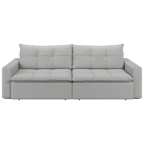 Material: O sofá possui estrutura em madeira de eucalipto reflorestada, assento retrátil com mecanismo metalico, espuma contínua D28 Supersoft sustentado por 4 molas de aço espirais e percinta sintética, encosto fixo com catraca em 3 estágios, almofadas com enchimento em fibra de silicone. O revestimento é em linho 100% poliéster, os módulos retráteis contam com rodinhas de silicone, os pés são de madeira e o acabamento é em costura prespontada com puxões no assento, unindo conforto, resistência e elegância.