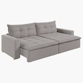 Material: O sofá possui estrutura em madeira de eucalipto reflorestada, assento retrátil com mecanismo metalico, espuma contínua D28 Supersoft sustentado por 4 molas de aço espirais e percinta sintética, encosto fixo com catraca em 3 estágios, almofadas com enchimento em fibra de silicone. O revestimento é em linho 100% poliéster, os módulos retráteis contam com rodinhas de silicone, os pés são de madeira e o acabamento é em costura prespontada com puxões no assento, unindo conforto, resistência e elegância.