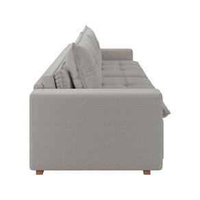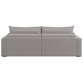 Material: O sofá possui estrutura em madeira de eucalipto reflorestada, assento retrátil com mecanismo metalico, espuma contínua D28 Supersoft sustentado por 4 molas de aço espirais e percinta sintética, encosto fixo com catraca em 3 estágios, almofadas com enchimento em fibra de silicone. O revestimento é em linho 100% poliéster, os módulos retráteis contam com rodinhas de silicone, os pés são de madeira e o acabamento é em costura prespontada com puxões no assento, unindo conforto, resistência e elegância.