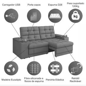 Estrutura: Madeira de Eucalipto de reflorestamentoRevestimento: Tecido Suede VeludoAssento: Retrátil, com percintas elásticas, enchimento em espuma D28, fibra e flocos de espuma, com altura de 15 cmEncosto: Reclinável, removível, com enchimento em fibra e flocos de espumaBraço: Fixo, com enchimento em espumaPés: Sim, em sapata PVCPorta USB: Sim, porta de entrada para carregamento do smartphone, necessita da fonte do smartphone para conetar na tomada de energiaPorta: Copo Sim, 02 porta-copos, sendo um em cada braço do sofáPeso Suportado: Suporta o peso de 120 kilosExtra: Apoio do braço deslizante, ou seja, quanto não tiver usando o porta-copos ou USB, você pode deslizar para tamparDimensões do produto montado