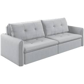 Material: O sofá possui estrutura em madeira de reflorestamento, assento retrátil com mecanismo metalico, pillow nos assentos com 16cm de espuma contínua D28 Supersoft sustentado por 4 molas de aço, encosto reclinável em 3 posições, almofadas soltas com enchimento em fibra de silicone. O revestimento é em linho 100% poliéster, os módulos retráteis contam com rodinhas de silicone, os pés são de madeira, unindo conforto, resistência e elegância.