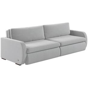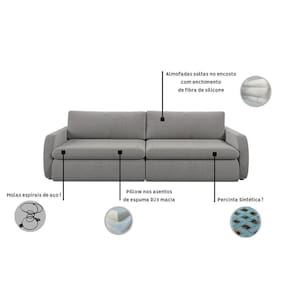 Material: O sofá possui estrutura em madeira de reflorestamento, assento retrátil com mecanismo metalico, pillow nos assentos com 16cm de espuma contínua D28 Supersoft sustentado por molas de aço, encosto reclinável em 3 posições, almofadas soltas com enchimento em fibra de silicone. O revestimento é em linho 100% poliéster, os módulos retráteis contam com rodinhas de silicone, os pés são de madeira, unindo conforto, resistência e elegância.