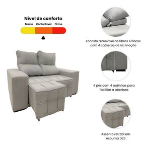 Visual moderno que combina com qualquer ambiente Estrutura firme e durável Espuma confortável para uso diário Encosto removível que facilita a limpeza e transporte Ideal para salas pequenas, apartamentos e espaços versáteis