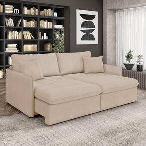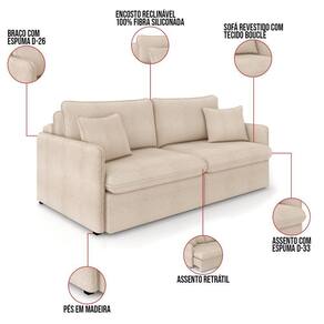 O Sofá Retrátil e Reclinável Maili 2 Lugares é a escolha perfeita para quem busca conforto e estilo em um só móvel. Com 154 cm de largura, revestido em tecido Bouclê, ele se destaca por sua aparência moderna e aconchegante. Produzido em madeira de lei (eucalipto), devidamente tratada e aparelhada, com reforços de cantoneiras e chapas em MDF, ideal para suportar o uso diário e manter a integridade do sofá. A estrutura metálica do mecanismo proporciona resistência e longa durabilidade, permitindo que o sofá se transforme em cama de forma segura e com facilidade. Para proporcionar conforto máximo, o assento é composto por espumas D33, molas ensacadas, molas espirais e manta acrílica, apoiadas em cintas metálicas, enquanto o encosto conta com cintas metálicas e 100% fibra siliconada, oferecendo um toque macio e relaxante. Os braços são feitos com espuma D26 para garantir um apoio confortável. O encosto reclinável possui sistema de catraca com 3 posições, permitindo ajustar o sofá de acordo com suas preferências de conforto. As almofadas soltas decorativas, além de realçar o estilo do sofá, oferecem flexibilidade para ajustar o conforto e personalizar o visual. Os pés em madeira na tabaco completam o design sofisticado, dando um toque elegante ao ambiente. Este maravilhoso sofá é ideal para momentos de descanso, seja assistindo a um filme ou simplesmente relaxando após um dia longo. Transforme seu espaço com o Sofá Maili. Aproveite agora! OBSERVAÇÃO IMPORTANTE: A entrega é realizada no endereço informado, não realizamos o transporte para andares superiores, como subir escadas, elevadores ou guinchos. Não realizamos montagens, desmontagens ou instalações. Todos esses serviços são de responsabilidade do comprador. Dimensões do Produto: Altura Total: 90 cm Largura Total: 154 cm Profundidade Total aberto: 155 cm Profundidade Total fechado: 115 cm Peso: 84 kg Outras Medidas: Largura total livre do assento: 140 cm Largura por lugar: 70 cm Profundidade total do assento aberto: 142 cm Profundidade total do assento fechado: 53 cm Altura do assento ao chão: 47 cm Altura do encosto: 50 cm Espessura do Braço: 7 cm Pillow: 16 cm Especificações do Produto: Estrutura: Madeira de Eucalipto/MDF. Material da Espuma: Assento D - 33; Encosto 100% Fibra Siliconada; Braço D - 26 Revestimento: Bouclê Possui Pés: Sim Tipo de Pés: Pés de Madeira na Tabaco Possui Rodízios: Não Diferenciais: Encosto Reclinável Catraca 03 Posições Peso Suportado: 150 Kg por assento. Quantidade de Lugares: 2 Lugares Tipo de Encosto: Reclinável. Tipo de Assento: Retrátil. Diferenciais: Almofadas Decorativas Soltas; Assento com percintas elasticas, molas espirais ensacadas e manta acrílica. Encosto reclinável com percintas elasticas. Manual de Montagem: Sim Montagem: O produto é enviado montado, sendo necessário somente parafusar os pés e fazer a junção dos módulos. Garantia: 90 dias contra defeito de fabricação Instruções de Limpeza: Utilizar um pano limpo e levemente úmido Você irá Receber: 01 Sofá Entregue em: 02 Volumes