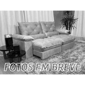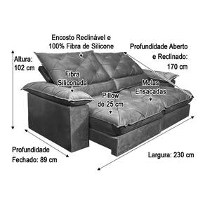 Sofá Retrátil Reclinável 2,30 m Cinza 502 Isa Nosso Sofá Retrátil Reclinável Isa é um produto autêntico, com design elegante que combina com qualquer ambiente e deixa sua sala ainda mais linda, aconchegante e moderna. MEDIDAS DO SOFÁ: Altura: 1.02 mLargura: 2.30 mProfundidade Sofá fechado: 89 cmSofá aberto Reclinável da ponta da almofada até o encosto: 1.70 m Assento: O assento retrátil contem espuma AG 45 Fibra de silicone, molas ensacadas, percinta elástica, que proporcionam uma acomodação extremamente confortável. Encosto: O encosto reclinável é feito com espuma 100% fibra de silicone. Além disso, as catracas são de ferro blindado com várias posições de inclinação, trazendo mais conforto para você na hora do descanso. Estrutura: Sua estrutura é com madeira de eucalipto, 100% reflorestada e seca em estufa, e os pés são produzidos em madeira e rodízio de silicone Revestimento: O revestimento é em tecido veludão, deixando a superfície do sofá muito mais macia. Braços: Braços com Fibra de silicone. * As imagens dos produtos são meramente ilustrativas. As cores podem sofrer variações dependendo da luminosidade, tipo de câmera ou mesmo da visualização das imagens em computadores, notebooks com telas LCD ou LED, tablets ou smartphones, dependendo da quantidade de pixels, podendo deixar as imagens com cores mais opacas ou cores mais vibrantes. Marca: Não Informado