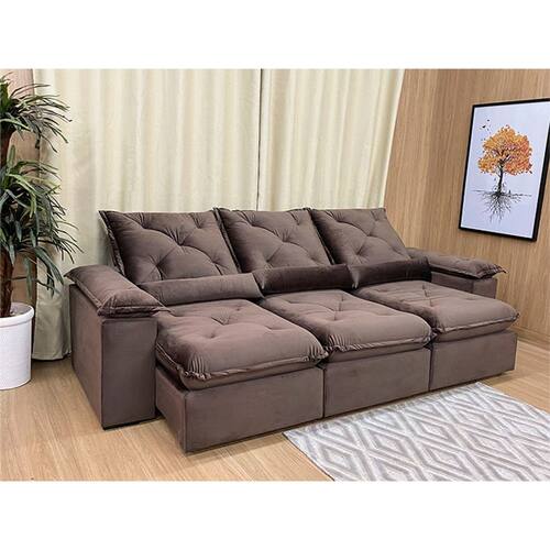 Sofá Retrátil Reclinável 2,70 m Marrom 500 Zuqui Plus Nosso Sofá Retrátil Reclinável Zuqui Plus é um produto moderno, com design elegante que combina com qualquer ambiente e deixa sua sala ainda mais linda e aconchegante. MEDIDAS DO SOFÁ: Altura: 1.00 mLargura: 2.70 mProfundidade fechado: 0.90 mProfundidade aberto: 1.65 m Assento: O assento com Pillow top 20cm é retrátil com espuma 28, contem também percinta elástica e molas bonel, que proporcionam uma acomodação extremamente confortável. Almofadas com fibras de poliéster siliconada. Encosto: O Encosto reclinável com espuma 100% fibra de silicone, trazendo mais conforto para você na hora do seu descanso. Braços: Os Braços são com espuma fibra de silicone Estrutura: Sua estrutura é com madeira de eucalipto, 100% reflorestada e seca em estufa, e os pés são produzidos em madeira e rodízio de silicone Revestimento: O revestimento é em tecido veludão Premium, deixando a superfície do sofá muito mais macia.