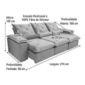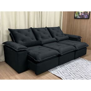 Sofá Retrátil Reclinável 2,70 m Preto 504 Zuqui Plus Nosso Sofá Retrátil Reclinável Zuqui Plus é um produto moderno, com design elegante que combina com qualquer ambiente e deixa sua sala ainda mais linda e aconchegante. MEDIDAS DO SOFÁ: Altura: 1.00 mLargura: 2.70 mProfundidade fechado: 0.90 mProfundidade aberto: 1.65 m Assento: O assento com Pillow top 20cm é retrátil com espuma 28, contem também percinta elástica e molas bonel, que proporcionam uma acomodação extremamente confortável. Almofadas com fibras de poliéster siliconada. Encosto: O Encosto reclinável com espuma 100% fibra de silicone, trazendo mais conforto para você na hora do seu descanso. Braços: Os Braços são com espuma fibra de silicone Estrutura: Sua estrutura é com madeira de eucalipto, 100% reflorestada e seca em estufa, e os pés são produzidos em madeira e rodízio de silicone Revestimento: O revestimento é em tecido veludão Premium, deixando a superfície do sofá muito mais macia.