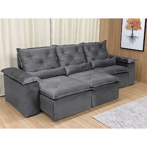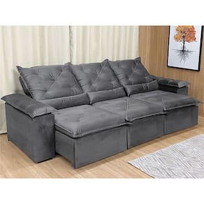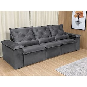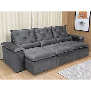 Sofá Retrátil Reclinável 2,90 m Cinza 202 Athenas Nosso Sofá Retrátil Reclinável 2,90 m Cinza 202 Athenas é um produto moderno, com design elegante que combina com qualquer ambiente e deixa sua sala ainda mais linda e aconchegante. MEDIDAS DO SOFÁ: Altura: 1.10 mLargura: 2.70 mProfundidade fechado: 90 cmProfundidade aberto: 1.65 m Assento: O assento retrátil contem espuma com pilow top de 13 cm de altura, percinta elástica, que proporcionam uma acomodação extremamente confortável. Encosto: O encosto reclinável é feito com espuma 100% fibra de silicone. Além disso, as catracas são de ferro blindado com várias posições de inclinação, trazendo mais conforto para você na hora do descanso. Estrutura: Sua estrutura é com madeira de eucalipto, 100% reflorestada e seca em estufa, e os pés são produzidos em madeira e rodízio de silicone Revestimento: O revestimento é em tecido veludinho, deixando a superfície do sofá muito mais macia. Braços: Braços com Fibra de silicone. * As imagens dos produtos são meramente ilustrativas.