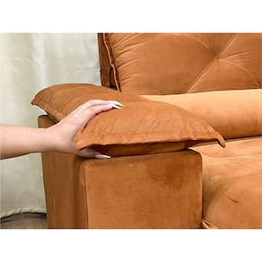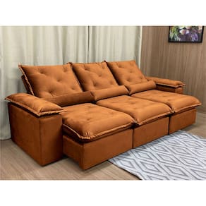 Sofá Retrátil Reclinável 2,90 m Terracota 509 Zuqui Plus Nosso Sofá Retrátil Reclinável Zuqui Plus é um produto moderno, com design elegante que combina com qualquer ambiente e deixa sua sala ainda mais linda e aconchegante. MEDIDAS DO SOFÁ: Altura: 1.00 mLargura: 2.90 mProfundidade fechado: 0.90 mProfundidade aberto: 1.60 m Assento: O assento com Pillow top 20cm é retrátil com espuma 28, contem também percinta elástica e molas bonel, que proporcionam uma acomodação extremamente confortável. Almofadas com fibras de poliéster siliconada. Encosto: O Encosto reclinável com espuma 100% fibra de silicone, trazendo mais conforto para você na hora do seu descanso. Braços: Os Braços são com espuma fibra de silicone Estrutura: Sua estrutura é com madeira de eucalipto, 100% reflorestada e seca em estufa, e os pés são produzidos em madeira e rodízio de silicone Revestimento: O revestimento é em tecido veludão Premium, deixando a superfície do sofá muito mais macia.