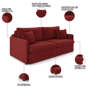 O Sofá Retrátil e Reclinável Maili 3 Lugares é a escolha perfeita para quem busca conforto e estilo em um só móvel. Com 194 cm de largura, revestido em tecido Veludo Vermelho, ele se destaca por sua aparência moderna e aconchegante. Produzido em madeira de lei (eucalipto), devidamente tratada e aparelhada, com reforços de cantoneiras e chapas em MDF, ideal para suportar o uso diário e manter a integridade do sofá. A estrutura metálica do mecanismo proporciona resistência e longa durabilidade, permitindo que o sofá se transforme em cama de forma segura e com facilidade. Para proporcionar conforto máximo, o assento é composto por espumas D33, molas ensacadas, molas espirais e manta acrílica, apoiadas em cintas metálicas, enquanto o encosto conta com cintas metálicas e 100% fibra siliconada, oferecendo um toque macio e relaxante. Os braços são feitos com espuma D26 para garantir um apoio confortável. O encosto reclinável possui sistema de catraca com 3 posições, permitindo ajustar o sofá de acordo com suas preferências de conforto. As almofadas soltas decorativas, além de realçar o estilo do sofá, oferecem flexibilidade para ajustar o conforto e personalizar o visual. Os pés em madeira na cor tabaco completam o design sofisticado, dando um toque elegante ao ambiente. Este maravilhoso sofá é ideal para momentos de descanso, seja assistindo a um filme ou simplesmente relaxando após um dia longo. Transforme seu espaço com o Sofá Maili. Aproveite agora!