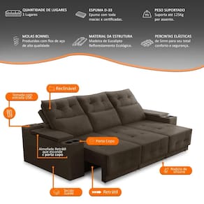 O Sofá Retrátil Reclinável Hannah com Porta Copos e USB proporciona conforto e praticidade, permitindo ajustar a posição do assento e relaxar com facilidade. Equipado com porta copos e entradas USB, é ideal para entretenimento e conveniência no dia a dia.