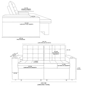 Altura: 102 cmLargura: 230 cmProfundidade fechado: 100 cmProfundidade aberto: 142 cmProfundidade do assento fechado: 52 cmProfundidade do assento aberto: 83 cmPeso: 65 kg