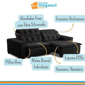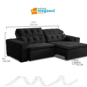 Ao chegar em casa nada melhor que o aconchego de um sofá extravagante em conforto, por isso conte com o Sofá 3 Lugares Retrátil e Reclinável Alasca 2,00m na cor PRETO, fabricado pela MegaSul, possui encosto reclinável, com catraca silenciosa 5 estágios, almofadas fixas de fibra siliconada. Perfeito para seus momentos de descanso e descontração! Valorize e complete o seu lar com muita beleza e funcionalidade! Aproveite e experimente o novo! O tecido veludo é de alto padrão, depois da seda, é um dos tecidos mais nobres. Possui textura ricamente macia e suave, associado a classe e elegância com a proposta de sensação ao toque mais sensível e encantador. Além de trazer sofisticação para o produto, ter variações de cores extremamente modernas, que agregam na decoração do seu ambiente, com o ar de sofisticação, mais decorativo. Estrutura do Sofá 3 Lugares Retrátil e Reclinável Alasca é eucalipto tratado de reflorestamento ecologicamente correto. O assento é retrátil, pillow, espuma D-28, revestido com manta fibra siliconada, contém molas individuais bonnel, corrediça metálica e percinta elástica. Dados Técnicos do Sofá 3 Lugares Retrátil e Reclinável Alasca: Largura: 2,00m Altura: 1,05m Profundidade com assento fechado: 1,15m Profundidade com assento aberto: 1,70m Cor: PRETO OBS: Estofado disponível em 8 cores em tecido veludo de alta qualidade. * Para escolher outra a cor, informe o código nas observações adicionais ao finalizar a compra. Tecido/Revestimento: Veludo Informações Adicionais: Garantia de 90 dias para defeitos de fabricação; Limpeza ou Manutenção: Utilizar escova com cerdas macias. NÃO utilizar produtos Abrasivos. Tecido/Revestimento: Veludo Montagem e instalação por conta do comprador; As imagens ambientadas são meramente ilustrativas e podem apresentar itens que não compõe o produto; As cores do produto podem variar de acordo com o monitor, a iluminação do ambiente ou sua percepção visual.