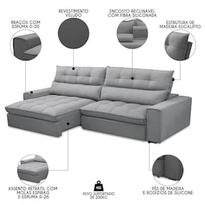 Altura: 115 cm | AssemblyRequired: Sim, sugerimos a contratação do nosso serviço de montagem (para os CEPs em que o serviço está dispon | Color: Cinza | ColorFamily: Cinza | ColorSimple: Cinza | ColorSupplier: Cinza | Cor: Cinza | Gênero: Unisex | Largura: 290 cm | Manual: Sim | Marca: Mpozenato | Material: Madeira de Eucalipto | MaterialFamily: Madeira de Eucalipto | Model: Damy | Origem: | OriginCountry: | OriginState: PR | Peso: 110 kg | Peso Suportado: 200 kg | ProductContents: 1 Sofá | ProductHeight: 115 | ProductInstructions: Produto para uso em ambiente interno, nao devendo ficar exposto ao sol, calor e umidade excessivos. | ProductLength: 120 | ProductWarranty: 90 dias após o do produto | ProductWeight: 110 | ProductWidth: 290 | Profundidade: 120 cm | Requere montagem: Sim | SizeDescription: 115 x 290 x 120 cm | SupplierSimpleName: Sofá Retrátil Reclinável 4 Lugares 290cm Damy F05 Veludo Cinza - Mpozenato | Tipo de : Fabricante