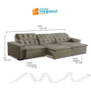Ao chegar em casa nada melhor que o aconchego de um sofá extravagante em conforto, por isso conte com o Sofá 07 Lugares Retrátil e Reclinável Alasca 3,50 m na cor Bege, fabricado pela MegaSul, possui encosto reclinável, com catraca silenciosa 5 estágios, almofadas fixas de fibra siliconada. Perfeito para seus momentos de descanso e descontração! Valorize e complete o seu lar com muita beleza e funcionalidade! Aproveite e experimente o novo! O tecido veludo é de alto padrão, depois da seda, é um dos tecidos mais nobres. Possui textura ricamente macia e suave, associado a classe e elegância com a proposta de sensação ao toque mais sensível e encantador. Além de trazer sofisticação para o produto, ter variações de cores extremamente modernas, que agregam na decoração do seu ambiente, com o ar de sofisticação, mais decorativo. Estrutura do Sofá 07 Lugares Retrátil e Reclinável Alasca é eucalipto tratado de reflorestamento ecologicamente correto. O assento é retrátil, pillow, espuma D-28, revestido com manta fibra siliconada, contém molas individuais bonnel, corrediça metálica e percinta elástica. Dados Técnicos do Sofá 4 Lugares Retrátil e Reclinável Alasca: Largura:3,50 m Altura: 1,05m Profundidade com assento fechado: 1,15m Profundidade com assento aberto: 1,70m 3 Módulos de 100 CM Braços de 25 cm cada Cor: Bege? 526 OBS: Estofado disponível em mais de 10 cores em tecido veludo de alta qualidade. * Para escolher outra a cor, informe o código nas observações adicionais ao finalizar a compra. Caso tenha alguma dúvida, ou não consiga escolher a cor durante a compra, Após a compra nosso atendimento entrará em contato com você para confirmar a COR e o TECIDO, fique tranquila (o). Informações Adicionais: Garantia de 90 dias para defeitos de fabricação; Limpeza ou Manutenção: Utilizar escova com cerdas macias. NÃO utilizar produtos Abrasivos. Tecido/Revestimento: Veludo Montagem e instalação por conta do comprador; As imagens ambientadas são meramente ilustrativas e podem apresentar itens que não compõe o produto; As cores do produto podem variar de acordo com o monitor, a iluminação do ambiente ou sua percepção visual. Informações sobre a entrega: VERIFIQUE as MEDIDAS para garantir que o sofá passe na porta e nos corredores de sua residência; NÃO NOS RESPONSABILIZAMOS por SUBIR o sofá por ESCADAS, NEM IÇAR o sofá;