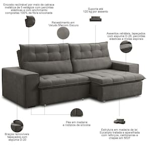Unidades por kit: 1 | Cor: Marrom Escuro | Requer montagem: Não | Altura: 110 cm | Tipo de produto: Sofá Retrátil Reclinável | Peso máximo suportado: 240 kg | Peso: 60 Kg | Orientação do Sofá: Frontal | Mecanismo de abertura do produto: Manual, rodízios de silicone | Material do estofamento: Veludo | Material de enchimento do encosto: Fibra Siliconada | Linha: Sala de Estar | Estilo: Moderno | Formato do sofá: Linear | Desenho do tecido: Liso | Fabricante: Lyam Decor | Densidade da espuma do assento: D-26 | Largura: 200 cm | Cor dos pés: Marrom | Profundidade: 98 cm | Quantidade de Caixas de embalagem: 1