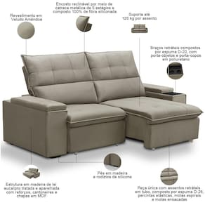 Unidades por kit: 1 | Cor: Amêndoa | Requer montagem: Não | Altura: 110 cm | Tipo de produto: Sofá Retrátil Reclinável | Peso máximo suportado: 240 kg | Peso: 60 Kg | Mecanismo de abertura do produto: Manual, rodízios de silicone | Material do estofamento: Veludo | Estilo: Moderno | Desenho do tecido: Liso | Fabricante: Lyam Decor | Profundidade: 98 cm | Formato do sofá: Linear | Densidade da espuma do assento: D-26 | Material de enchimento do encosto: Fibra Siliconada | Orientação do Sofá: Frontal | Cor dos pés: Marrom | Largura: 210 cm | Quantidade de Caixas de embalagem: 1 | Linha: Sala de Estar