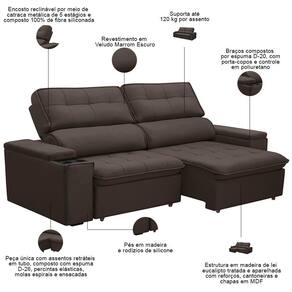 Unidades por kit: 1 | Cor: Marrom Escuro | Requer montagem: Não | Altura: 108 cm | Tipo de produto: Sofá Retrátil Reclinável | Peso máximo suportado: 240 kg | Peso: 60 Kg | Orientação do Sofá: Frontal | Mecanismo de abertura do produto: Manual, rodízios de silicone | Material do estofamento: Veludo | Material de enchimento do encosto: Fibra Siliconada | Linha: Sala de Estar | Estilo: Moderno | Formato do sofá: Linear | Desenho do tecido: Liso | Fabricante: Lyam Decor | Densidade da espuma do assento: D-26 | Largura: 210 cm | Cor dos pés: Marrom | Profundidade: 98 cm | Quantidade de Caixas de embalagem: 1