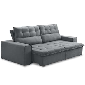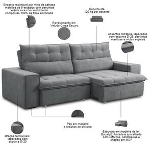Sofá Retrátil Reclinável Para Sala 3 Lugares 220cm Neruda F04 Veludo Cinza Escuro - Lyam Decor