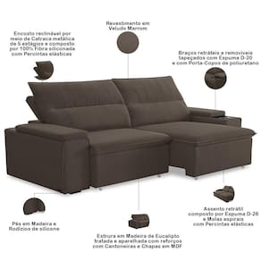 Altura: 110 cm | Color: Marrom | ColorFamily: Marrom | ColorSimple: Marrom | ColorSupplier: Marrom | Cor: Marrom | Densidade da espuma do assento: D-26 | Desenho do tecido: Liso | Estilo: Moderno | Fabricante: Lyam Decor | Formato do sofá: Linear | Largura: 225 cm | Linha: Sala de Estar, Living | Material: Madeira de Eucalipto, Cantoneiras, Chapas em MDF | Material de enchimento do encosto: Fibra Siliconada | Material do estofamento: Veludo | MaterialFamily: Madeira de Eucalipto | Mecanismo de abertura do produto: Manual | Model: Ricci | Orientação do Sofá: Frontal | OriginCountry: Brasil | OriginState: PR | Peso: 70 kg | Peso máximo suportado: 360 kg | ProductContents: 01 Sofá | ProductHeight: 110 cm | ProductInstructions: Produto para uso em ambiente interno, nao devendo ficar exposto ao sol, calor e umidade excessivos. | ProductLength: 98 cm | ProductWarranty: 90 dias após o recebimento do produto | ProductWeight: 70 kg | ProductWidth: 225 cm | Profundidade: 98 cm | Quantidade de Caixas de embalagem: 1 | Requer montagem: Não | SizeDescription: Altura: 110 cm x Largura: 225 cm x Profundidade: 98 cm | SupplierSimpleName: Sofá Retrátil Reclinável Para Sala 3 Lugares 225cm Ricci F04 Veludo Marrom - Lyam Decor | Tipo de produto: Sofá Retrátil Reclinável | Unidades por kit: 1
