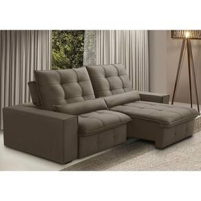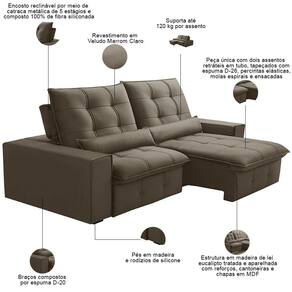 Unidades por kit: 1 | Cor: Marrom Claro | Requer montagem: Não | Tipo de produto: Sofá Retrátil Reclinável | Altura: 115 cm | Peso máximo suportado: 240 kg | Peso: 80 Kg | Orientação do Sofá: Frontal | Mecanismo de abertura do produto: Manual, rodízios de silicone | Material do estofamento: Veludo | Material de enchimento do encosto: Fibra Siliconada | Linha: Sala de Estar | Formato do sofá: Linear | Estilo: Moderno | Fabricante: Lyam Decor | Desenho do tecido: Liso | Densidade da espuma do assento: D-26 | Largura: 230 cm | Cor dos pés: Marrom | Profundidade: 121 cm | Quantidade de Caixas de embalagem: 1