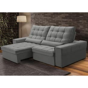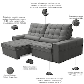 Unidades por kit: 1 | Cor: Cinza claro | Altura: 115 cm | Material do estofamento: Veludo | Fabricante: Lyam Decor | Peso: 80 Kg | Tipo de produto: Sofá Retrátil Reclinável | Orientação do Sofá: Frontal | Densidade da espuma do assento: D-26 | Cor dos pés: Marrom | Peso máximo suportado: 240 kg | Mecanismo de abertura do produto: Manual, rodízios de silicone | Desenho do tecido: Liso | Largura: 230 cm | Requer montagem: Não | Estilo: Moderno | Formato do sofá: Linear | Material de enchimento do encosto: Fibra Siliconada | Profundidade: 121 cm | Linha: Sala de Estar | Quantidade de Caixas de embalagem: 1