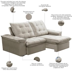 Cor: Bege | Unidades por kit: 1 | Requer montagem: Não | Tipo de produto: Sofá Retrátil Reclinável | Altura: 110 cm | Peso máximo suportado: 240 kg | Peso: 75 Kg | Orientação do Sofá: Frontal | Mecanismo de abertura do produto: Manual, rodízios de silicone | Material do estofamento: Veludo | Material de enchimento do encosto: Fibra Siliconada | Linha: Sala de Estar | Formato do sofá: Linear | Estilo: Moderno | Fabricante: Lyam Decor | Desenho do tecido: Liso | Densidade da espuma do assento: D-26 | Largura: 230 cm | Cor dos pés: Marrom | Profundidade: 110 cm | Quantidade de Caixas de embalagem: 1
