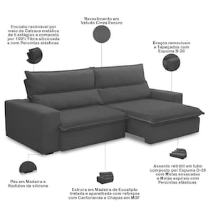Altura: 110 cm | Color: Cinza Escuro | ColorFamily: Cinza Escuro | ColorSimple: Cinza Escuro | ColorSupplier: Cinza Escuro | Cor: Cinza Escuro | Densidade da espuma do assento: D-26 | Desenho do tecido: Liso | Estilo: Moderno | Fabricante: Lyam Decor | Formato do sofá: Linear | Largura: 230 cm | Linha: Sala de Estar, Living | Material: Madeira de Eucalipto, Cantoneiras, Chapas em MDF | Material de enchimento do encosto: Fibra Siliconada | Material do estofamento: Veludo | MaterialFamily: Madeira de Eucalipto | Mecanismo de abertura do produto: Manual | Model: Senzi | Orientação do Sofá: Frontal | OriginCountry: Brasil | OriginState: PR | Peso: 74 kg | Peso máximo suportado: 360 kg | ProductContents: 01 Sofá | ProductHeight: 110 cm | ProductInstructions: Produto para uso em ambiente interno, nao devendo ficar exposto ao sol, calor e umidade excessivos. | ProductLength: 110 cm | ProductWarranty: 90 dias após o recebimento do produto | ProductWeight: 74 kg | ProductWidth: 230 cm | Profundidade: 110 cm | Quantidade de Caixas de embalagem: 1 | Requer montagem: Não | SizeDescription: Altura: 110 cm x Largura: 230 cm x Profundidade: 110 cm | SupplierSimpleName: Sofá Retrátil Reclinável Para Sala 3 Lugares 230cm Senzi F04 Veludo Cinza Escuro - Lyam Decor | Tipo de produto: Sofá Retrátil Reclinável | Unidades por kit: 1