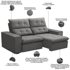 Sofá Retrátil Reclinável Para Sala 3 Lugares 230cm Vincent F04 Veludo Cinza Claro - Lyam Decor