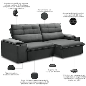 Com seu mecanismo retrátil e reclinável, você ajusta cada detalhe para criar a posição ideal - seja para maratonar sua série favorita, ler um bom livro ou receber amigos com todo o aconchego. Além disso, o design sofisticado surpreende pela funcionalidade: equipado com porta-copos integrados, mantém tudo ao alcance das mãos durante seus momentos de relaxamento. A combinação de molas espirais e espuma D-26 de alta densidade garante um apoio perfeito para o corpo, oferecendo conforto que dura horas sem perder a firmeza.