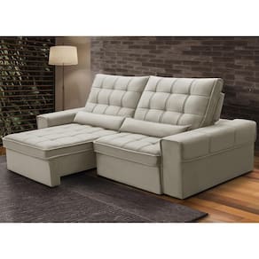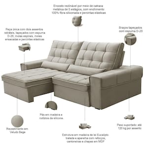 Formato do sofá: Linear | Estilo: Moderno | Orientação do Sofá: Frontal | Material do estofamento: Veludo | Peso: 90 kg | Material de enchimento do encosto: Fibra Siliconada | Desenho do tecido: Liso | Unidades por kit: 1 | Cor: Bege | Peso máximo suportado: 240 kg | Linha: Sala de Estar | Densidade da espuma do assento: D-26 | Quantidade de Caixas de embalagem: 1 | Requer montagem: Não | Mecanismo de abertura do produto: Manual, rodízios de silicone | Profundidade: 121 cm | Largura: 250 cm | Altura: 115 cm | Tipo de produto: Sofá Retrátil Reclinável | Cor dos pés: Marrom | Fabricante: Lyam Decor