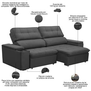 Unidades por kit: 1 | Cor: Cinza Escuro | Requer montagem: Não | Altura: 108 cm | Tipo de produto: Sofá Retrátil Reclinável | Peso máximo suportado: 240 kg | Peso: 80 Kg | Orientação do Sofá: Frontal | Mecanismo de abertura do produto: Manual, rodízios de silicone | Material do estofamento: Veludo | Material de enchimento do encosto: Fibra Siliconada | Linha: Sala de Estar | Estilo: Moderno | Formato do sofá: Linear | Desenho do tecido: Liso | Fabricante: Lyam Decor | Densidade da espuma do assento: D-26 | Largura: 250 cm | Cor dos pés: Marrom | Profundidade: 98 cm | Quantidade de Caixas de embalagem: 1
